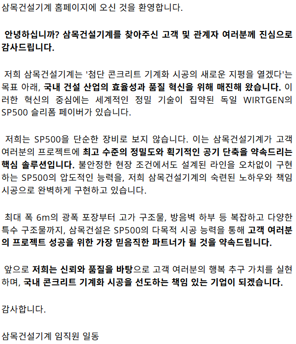 인사말 삼목건설기계 홈페이지에 오신것을 환영합니다. 삼목건설기계를 이끄는 사람들 삼목건설기는 토목기계 전문 시공 분야를 선도하며, “고객의 만족이 우리의 만족”이라는 가치관 아래 항상 정확성과 품질 중심의 시공 서비스를 제공합니다. 특히, 측량 및 시공 노하우를 갖춘 기술자들과 20년 경력의 숙련된 오퍼레이터를 보유하여 현장의 전문성을 높이고 있습니다. C.E.O대표 Director이사 SP500 Team Leader1호기 팀장 SP250 Team Leader2호기 팀장 "저희 삼목건설기계는 45년 경력의 토목 특급 기술자와 20년 경력의 장비 기술 전문가의 협업으로, 성공적인 프로젝트 완수를 위한 책임 시공을 보장합니다."